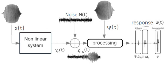 There are numerous techniques in the technical literature for identifying such models [14,15], and in particular, in the case of the Hammerstein model, a technique that has proven to be particularly effective is based on the use of appropriate swept-sine signals as input [16,17,18,19]. This technique has yielded excellent results in numerous application areas, including acoustics and nondestructive testing and evaluation [20,21,22,23].