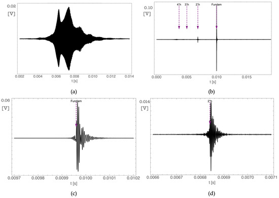 The signal at different stages of processing obtained starting from the data measured in the laboratory with the measuring bench described in Figure 4: (a) Signal received by the Rx probe; (b) output of the matched filter; (c,d) magnifications of the fundamental frequency and 2° harmonic peaks.
