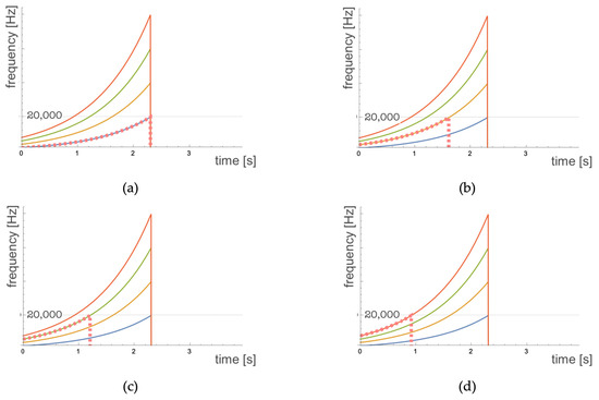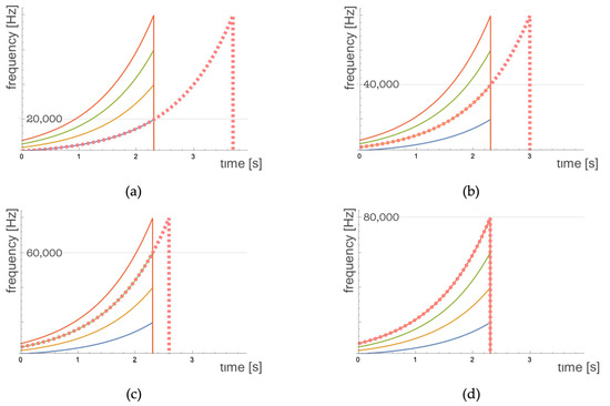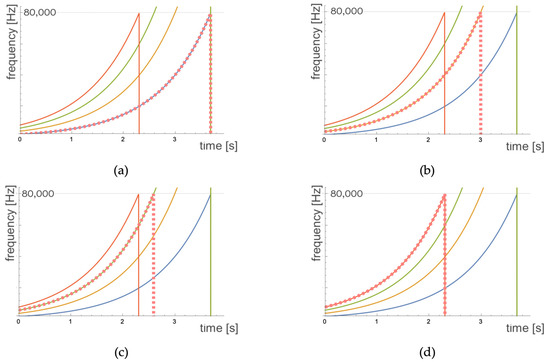 Frequency overlap in the case in which both the matched filter and the input swept signal range between and . The solid lines represent the swept-sine signal (blue line) its second harmonic (orange line) its third harmonic (green line) and its fourth harmonic (red line). The dotted line represents the frequency band covered by the adapted filter. The four panels represent the cases when the matched filter correlates with (a) the fundamental frequency; (b) the second harmonic; (c) the third harmonic; (d) the fourth harmonic.