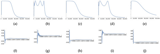 where superscript T denotes transposed matrix. In this case, the zero frequency component was not considered. The resulting matrix , deprived of the first row and of the first column, is denoted as in [19]. The fact that the matrices and , which appear in Equations (10) and (11) and link the functions and , are upper triangular, has relevant consequences from the examined perspective, as discussed in the following.