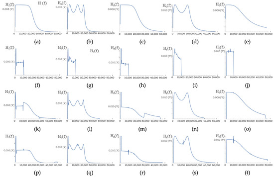 In the case of identification Procedure 3 (panels “p” to “t”), the trends faithfully reflect throughout the frequency band of interest the ideal trends. It is evident that the result comes from the combination of several components and, in fact, at frequency multiples of , small irregularities are found; however, the overall trend is consistent with the ideal reference, and this denotes that there is a correct combination of all the necessary components. The only aspect that merits some further investigation concerns the peak found at the minimum frequency .