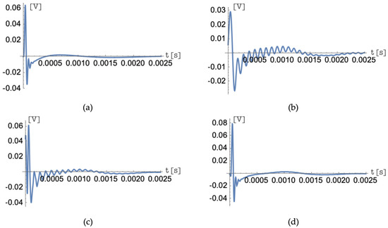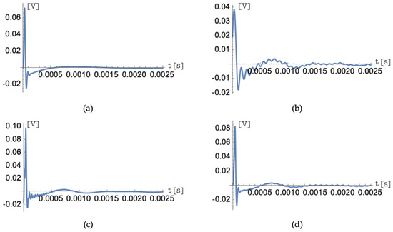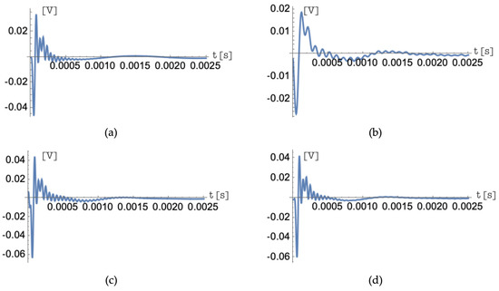 Figure 11, Figure 12 and Figure 13 show similar results in the time domain, comparing, in each figure, the ideal impulse responses and those obtained with the three choices of the frequency bands of the input signal and of the corresponding impulse response of the matched filter. Figure 11, Figure 12 and Figure 13 show the comparison of the results over time for the impulse responses , and , respectively. The time-domain analysis also confirms all the assumptions made. The best approximation always occurs when the chosen frequency bands range from to and, in the case of different choices for frequency bands, the trends of the lowest index functions are most strongly affected by this frequency limitation.