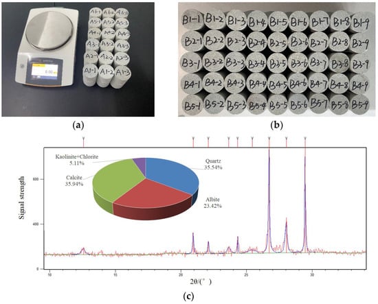 Samples were processed into a dimension of Φ50 mm × h100 mm, with groups and numbers shown in Figure 1a,b. The mineral composition of this batch of sandstone samples was obtained by D8 ADVANCE X-ray diffractometer analysis, including 35.5% of quartz, 23.4% of plagioclase, 35.9% of calcite, and 5.1% of kaolinite and chlorite, and the test results are shown in Figure 1c.