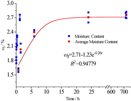 After the measurement and calculation, the corresponding relationship between the immersion time t of the rock specimen and the water content ωt of the specimen is shown in Figure 3. In the initial stage of water immersion, the water content of the rock specimen increased rapidly, and then the growth rate of water content gradually slowed down. After the water was fully absorbed by the rock, resulting in saturation, the water content of the rock remained at a stable value. Therefore, with a sufficient water supply, the water content of the rock specimen increases with a time threshold t0. In other words, before the time threshold t0 is reached, the corresponding relationship between the immersion time t of the rock specimen and the water content ωt follows an exponential growth. After reaching the time t0, the water content of the rock tends to remain constant, reaching the final saturated water content. According to the test results of the water content of rock samples, the variation law of water content ωt with t can be summarized as Formula (24), with the saturated water content of 2.790% after function fitting.