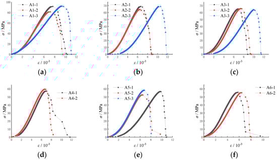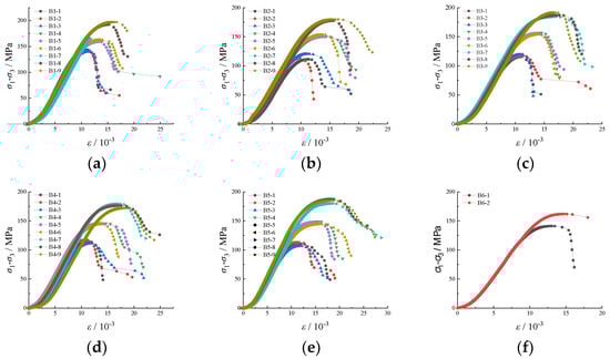 The triaxial compression test results of sandrock containing water. (a) Dry Sample; (b) Sample Submerged for 0.75 h; (c) Sample Submerged for 1.5 h; (d) Sample Submerged for 6 h; (e) Sample Submerged for 24 h; (f) Sample Submerged for 720 h.
