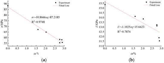 In order to further explore the impacts of the water content on the mechanical characteristics of the sandstone specimens, based on the experimental results, the relationship between the failure strength, elastic modulus, and water content of the specimens was fitted and analyzed, as shown in Figure 6 and Figure 7.