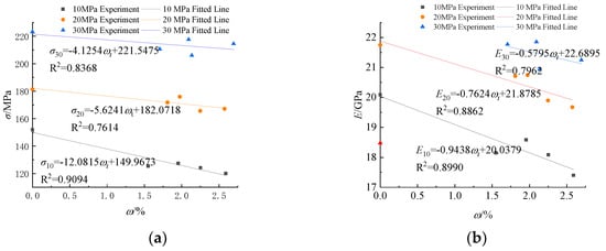 According to Figure 7, in the conventional triaxial compression test, the peak strength and elastic modulus of the sandstone under different confining pressures decrease linearly with the increase of water content, demonstrating a higher level of fitting linear relationship under the condition of the low confining pressure. Meanwhile, a lower confining pressure leads to a larger slope of the fitting curve, indicating that the increase in the confining pressure has a positive effect on restraining rock mass damage.