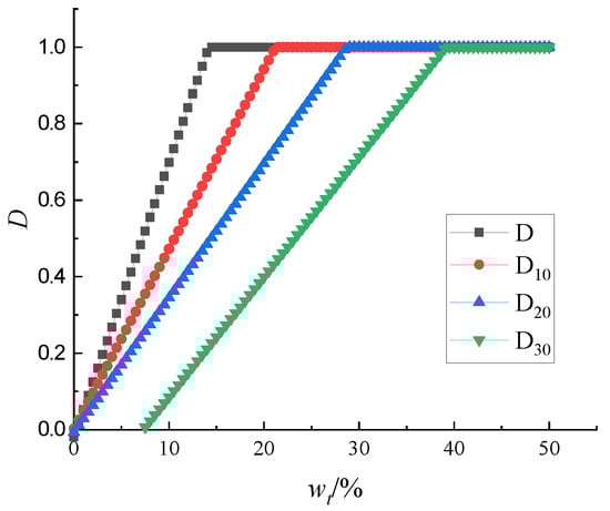 Based on the test results, the damage variance curve of the water-containing sandstone specimen under different stress paths is drawn as shown in Figure 8. As shown in Figure 8, with the increase in water content, the damage to rock samples increases sharply. When the water content reaches the limit, the damage value reaches 1, with no more accumulation. Meanwhile, with the increase of the confining pressure, the rate of damage evolution slows down, indicating that the ability of rock to resist damage can be strengthened with the increase of confining pressure.