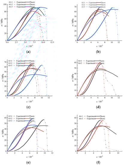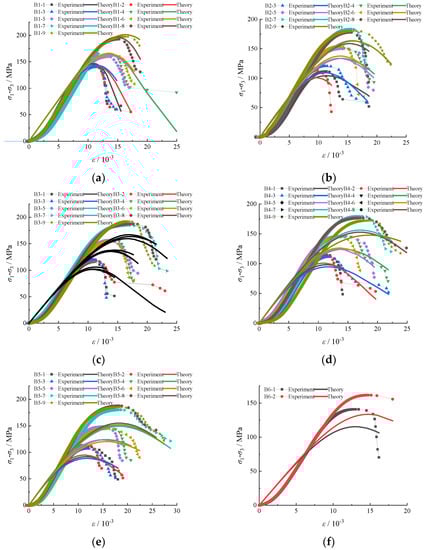 Based on the average strength and the average strain () of the sandstone specimens at different water contents (), the corresponding m1 and m2 values can be obtained, as shown in Table 3 and Table 4. The further stress–strain experimental curves and theoretical damage curves of sandstone specimens are shown in Figure 9 and Figure 10, respectively.