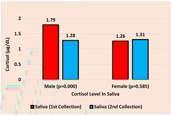 The average cortisol levels in the saliva of the participating students at two distinct time periods are compared by gender in Figure 3. For the male subjects, the mean and standard deviation of the cortisol levels on the first and second visits were 1.79 + 0.50 and 1.28 + 0.67, respectively. For the male subjects, the comparisons showed a significant difference (p = 0.000) between the cortisol levels at the two time points. For the female subjects, the mean and standard deviation of the cortisol levels on the first and second visits were, respectively, 1.26 + 0.50 and 1.31 + 0.73. The comparisons showed that there was no statistically significant difference (p = 0.585) between the cortisol levels for the female subjects at the two time points (Figure 3).