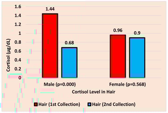It is widely established in the literature that cortisol levels vary from day to day [,,,]. The findings of the current investigation also point to the existence of these daily variations in cortisol levels. Even if there were changes in the cortisol levels for the female participants, they were not statistically significant. It is interesting to note that, for females, the variations in cortisol levels for both saliva and hair samples displayed a similar non-significant trend. In contrast, there were noticeable changes in the male participant’s saliva and hair cortisol levels. These variations may be attributed to the normal variations in stress that the male participants experienced on various days of the week. In earlier investigations, it was discovered that men had higher cortisol levels than women []. This pattern was also shown in the results of the current investigation, wherein the levels of cortisol in the saliva and hair samples of the male participants were higher than those of the female participants. The non-significant variations in cortisol levels between the two time points for the female individuals, however, are an intriguing discovery and might make for an interesting research topic.
