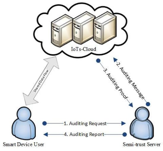 In the traditional schemes shown in Figure 1, the smart device user generates the public and private parameters, computes the metadata of their files using the public parameters, and signs the metadata through employing private parameters. The smart device user also transmits file and metadata to the IoT-cloud system and metadata to the semi-trust server. The smart device user sends a request to the semi-trust server to confirm that the data have been stored in the IoT-cloud system. The semi-trust server generates a challenge request and sends it to the semi-trust server.