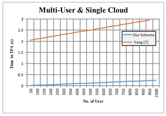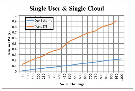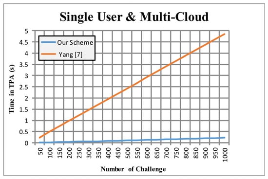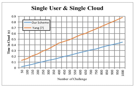 This stage contrasts the number of challenges, the number of smart device users, and the number of clouds with the semi-trust server’s computation time. In the first instance, the semi-trust server’s computation time was assessed depending on the volume of challenged files in the single smart device user and the single IoT-cloud system. The size of the challenge data was calculated to be equal to 1000 kilobytes. If the number of challenges reached 1000, then the size of the challenges data was equal to 1000 kilobytes. It can demonstrate that there is a linear relationship between the challenge number and the computation cost of the semi-trust server. In Figure 4, it is clear that when handling large volumes of challenged data, the computational cost is higher in Yang’s solution [7] than in the proposed solution; this is because the challenge size key in the proposed system is (Ck = 128 bit) and is independent of the challenged data size. In contrast with Yang [7], which depends on the size of the data, when the challenge data increases, so does the challenge key. Consequently, a highly efficient scheme has been improved in the proposed work. It can also further reduce the computation complexity.