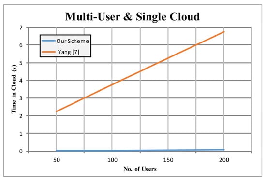 This study looked at the number of files sent to one smart device user (Figure 7) and the overall amount of data for smart device users (Figure 8) and compared the computation cost of the IoT-cloud system. Compared with the proposed system, it is clear that Yang’s scheme [7] incurred a higher computation cost for the IoT-cloud system.
