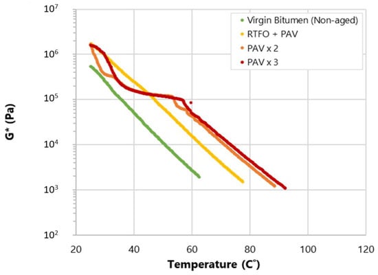 Bitumen, upon aging, becomes stiffer and more rigid, thereby increasing its transition temperature. In this study, from the rheological point of view, the complex modulus G* which is bitumen’s overall resistance to deformation is evaluated in relation to the loss tangent (tan delta). Tan delta is the relationship between the storage (viscous) modulus (G″) and the loss (elastic) modulus (G′) of the material. G* is a direct measure of the rigidity of bitumen’s soft solid structure when exposed to stresses below the yield stress, and this makes it a good indicator of the flexibility or stiffness of bitumen. With increasing temperature, G′ decreases at a faster rate than G″, and so a crossover temperature occurs. This temperature is the temperature that was earlier referred to as the transition temperature [17]. The DSR profiles shown below depict G* in relation to the crossover temperatures of the samples. Higher transition temperature values imply greater stiffness of a sample.