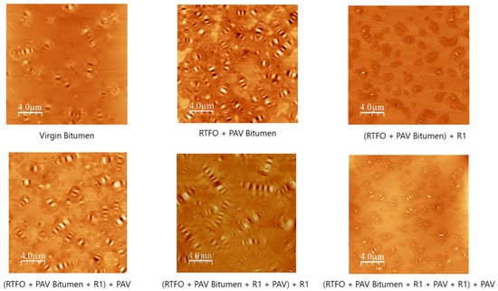 As can be seen from Figure 3, the aging of the bitumen brought about an enlargement and roughening of the catana phase. This can be explained by the incorporation of oxygen by the asphaltenes during aging, and this translates to an increase in stiffness and rigidity of the bitumen, since the bee structures grow larger in size [22]. The para phase, which probably represents the maltenic fraction of bitumen, also diminished with aging. The addition of the R1 recycling agent is shown to reduce the size of the asphaltenes, and also restore the maltenic fraction, thus making it similar to non-aged bitumen. These aforementioned changes in bitumen’s morphology were repeatedly observed with the subsequent aging and addition of R1 recycling agent. The bee structures increased in size due to their incorporation of oxides via oxidative aging, and also formed clusters. These clusters usually occur due to asphaltene aggregation, making the aged bitumen stiff and fragile, and thus susceptible to cracking [23]. The first addition of the R1 recycling agent reversed this increase in bee structure size, and then the second aging cycle increased the bee structure size again. The second cycle of R1 modification of the aged bitumen brought about, once again, a reduction in the size of the bee structures; the third aging cycle slightly increased the bee structure size, even though the effect of the third cycle of aging on the recycled bitumen was not highly pronounced, likely due to the significant amount of the R1 recycling agent present in the sample. This shows the effectiveness of R1 in restoring the balance of the ratio of the different fractions of aged bitumen, reversing the effects of multiple aging cycles.