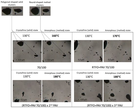 This is a microscopy technique that also combines the use of a light microscope with the concept of basic calorimetry. It involves monitoring the response of asphaltene particles to a gradual increase in temperature, and this response can be observed in real time under the microscope. Even though this technique is a qualitative method, its validity and accuracy has been verified using differential scanning calorimetry, as shown in previous studies [2,12,17]. This microscopy technique is a form of real-time observation of the transition from one state to another, a parameter that differential scanning calorimetry usually measures. Bitumen, after aging, exhibits an increase in rigidity in its solid form and viscosity in its liquid form. Since the asphaltenes are the fraction of bitumen susceptible to oxidative aging [22,27], it is only logical to investigate the response of asphaltenes to an increase in temperature. Aged asphaltenes become more heat resistant, and melt at higher temperatures compared to unaged virgin bitumen [23,29]. The melting point of an asphaltene is the temperature at which it transitions from a crystalline to an amorphous state. The images in Figure 5 show the asphaltenes of each sample and the temperatures at which they transition from crystalline to amorphous states.