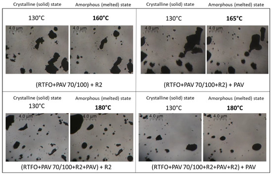 Light microscopy images indicating asphaltene melting points of R2-modified and aged 70/100 bitumen.