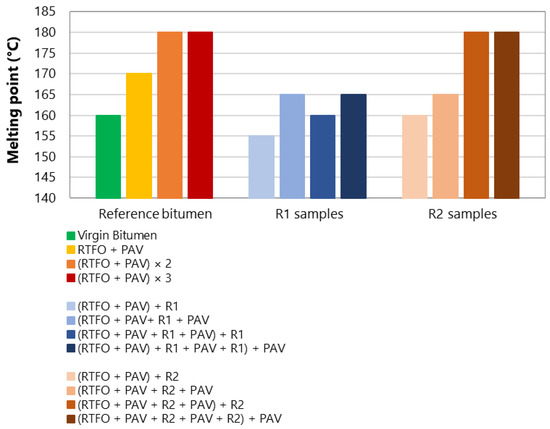 On the other hand, in the case of the R2 recycling agent, when it was added to the bitumen sample that was aged once, the melting point of the asphaltenes reduced from 170 °C to 160 °C, as can be seen in Figure 7. This recycled sample was aged again, and the melting point of the asphaltenes increased to 165 °C. This twice-aged sample was modified again with R2, and the melting point of the asphaltenes was even higher (180 °C, which is the same melting point as the neat bitumen aged twice). This means that the second modification of the bitumen with the R2 recycling agent was not effective, and even worsened the effects of aging on the asphaltenes thermal properties. This twice-recycled bitumen was aged for the third time, and the asphaltene melting point remained the same at 180 °C. It can thus be said that the R2 recycling agent, after the first recycling process, did not in any way improve the bitumen sample. This could be because R2 is a mere fluxing agent that softens the bitumen and reduces its viscosity. It does not truly interact chemically with the aged bitumen to restore its virgin properties. Fluxing agents only augment the maltenic fraction of bitumen, thus reducing its viscosity and improving its flow. No real changes in the chemical structure of aged bitumen are usually observed when a fluxing agent is used to modify bitumen [2,17].