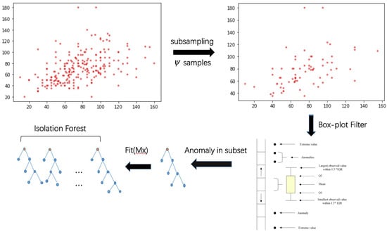 | Inputs: X—input data, t—number of trees, —sub-sampling size Output: a set of BS-iForest trees 1: intialize Forest 2: set height limit l = ceiling() 3: i = 1 4: while i <= t { 5: X’sample(X,){ 6: if(box-plot-filter(X’)) 7: ForestForest iTree(X’,0,l) 8: i = i + 1 } 9: else continue 10:} 11: for j = 1 to iTrees_num in Forest 12: compute(fit(iTree[j]) 13: end for 14: select top k iTrees for BS_iForest //k < t 15: return BS-iForest |