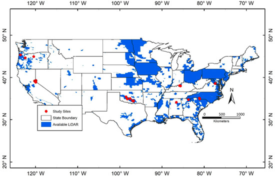 Location of study sites and available LiDAR data. The red dots indicate a total of 30 study watersheds across the ten states and the blue dots means the availability of LiDAR raw point data in the United States as of 2015.
