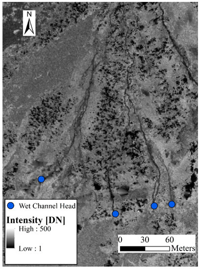 Figure 2 shows the intensity map for a headwater catchment in Ward Creek. Intensity is encoded as a digital number (DN), which is the raw values recorded by the sensor. Wet channels show consistently lower intensities and continuous patterns compared to other locations, such as hill slopes and dry channels. Wet channel heads, which are the starting points of wet channels, are visually detected and displayed by a blue dot.