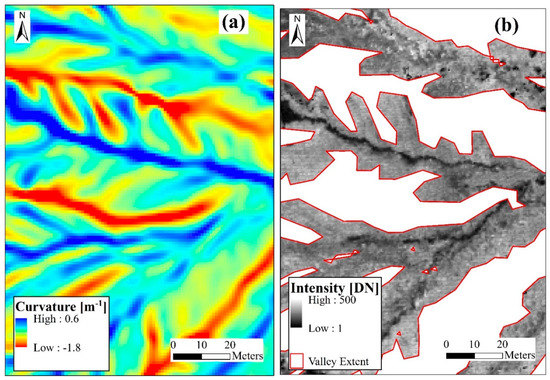 A contour curvature map and the identified valley extent determined by the curvature threshold in a sub-catchment of the Ward Creek watershed. (a) The contour curvature and the visible detection of the drainage path determined by blue color pixels. (b) The intensity returns within the valley extent determined by the curvature threshold in the Ward Creek watershed in the 2012 LiDAR survey [DN: digital number].