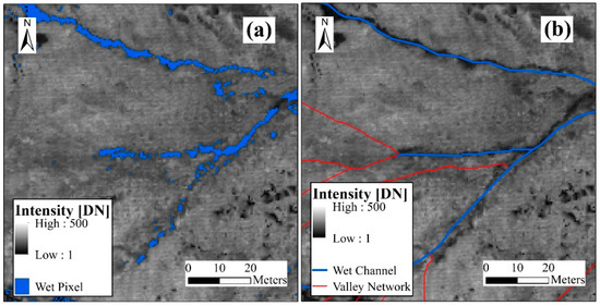 The identified wet pixels and the connected wet channel network with the valley network. (a) The identified wet pixels based on the intensity thresholds. (b) The connected wet channel network with the valley network after processing isolated wet channel segments based on the 2012 LiDAR survey in the Ward Creek watershed [DN: digital number].