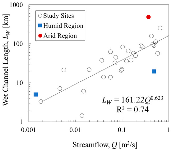 The relationship between wet channel length () and streamflow (Q) for the study watersheds is plotted in Figure 5, and the total valley length, wet channel length, and wet channel ratio are listed in Supplementary Table S1, organized in the climate aridity index () from the smallest to the largest. Three watersheds were excluded from the data as they were excessively humid (: 0.3~0.4) and arid (: 2.7), and they displayed uncharacteristic patterns of wet channel length and streamflow patterns. The range of was 0.8 to 2.1 for the remaining 27 watersheds with 29 LiDAR snapshots, and the best fit function was = 161.22Q0.623 with R2 = 0.74, as shown in Figure 5. The scaling exponent of the power–law relationship (i.e., 0.623) was within the range of the reported values (i.e., 0.042~0.688) in the literature from fieldwork conducted in 14 watersheds in other regions [38].