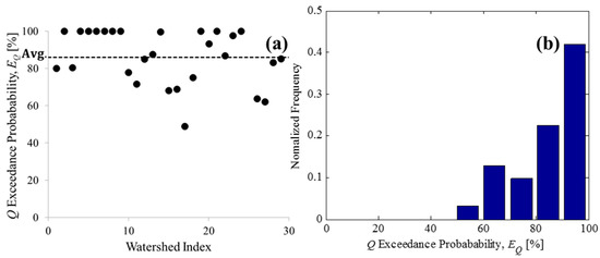 Streamflow exceedance probability of the perennial streams and its normalized frequency distribution. (a) Streamflow exceedance probability ( of the perennial streams in the study watersheds using the relationship between the wet channel ratio () and ; and (b) normalized frequency distribution of for all of the study sites.