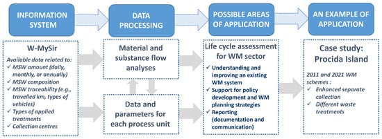 The scientific literature highlights the crucial role of high-quality data to develop reliable life-cycle assessment (LCA) studies, particularly in the waste-management sector [,,]. Data contained in the W-MySir platform appear particularly suitable to support this kind of study, which the European Union considers to be the best way to quantitatively assess the environmental performance of a good or service []. W-MySir provides certified data about amounts gathered by municipal waste streams, the related percentages for separate collection, the number of journeys specifically made for each EWC, together with other information related to the transport (e.g., distance covered, type of vehicle, its identification, shipping certificate, company name) and destination (e.g., location, type of treatment). These data can also be used as a reliable basis to assess, from a life-cycle perspective, the performances of different MSW management scenarios related to different areas in a specific time, or to the same area at different time intervals. In other words, data obtainable from W-MySir, when properly processed, can be combined with the LCA procedure to provide a comprehensive understanding of an existing waste-management system, and to identify possible areas for further improvement. If the focus is on a specific municipality, data related to different years can also be used to analyse the evolution of the WM system, to quantify its environmental performances, and to evaluate whether the adopted criteria have produced the expected results. Figure 1 schematically describes the flow of data between the W-MySir platform and the proposed LCA case study, which refers to municipal solid waste management in 2011 and 2021 in the municipality of the island of Procida, one of the three islands (together with Ischia and Capri) of Naples Bay. An example of the data types that can be provided by the information system is reported in the tables and diagrams of ANNEX A.