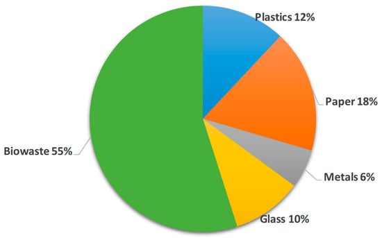 The reference composition as obtained is reported in Figure 3, starting from the compositions of all the separately collected waste streams (as available on W-MySir) and that of URW (obtained by combining the composition of URW in input to the waste-to-energy (WtE) unit active in Campania [], coupled with the separation efficiencies of the material recovery facility, MRF, active in the same regional area []). Most of data were acquired by the W-MySir platform, with the support of Conai, who provided data related to the selection and remanufacturing residues of the main recycling chains, indicating that the “quality of data” was quite high. Moreover, an extended analysis of scientific and technical studies was carried out to estimate and compare all the direct and avoided environmental burdens. The Ecoinvent databank v.3.6 [] was used to quantify the indirect burdens, while those related to the infrastructures were not considered.