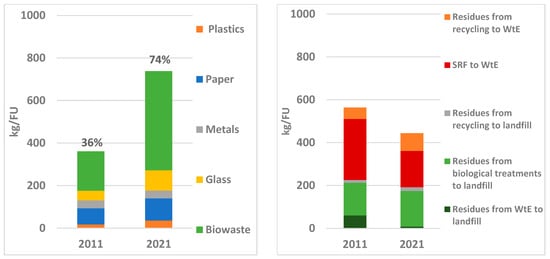 Comparisons between amounts of separately collected waste streams in Procida in 2011 and 2021 (left), and amounts sent to thermal treatments or disposal in landfill in the same years (right). Data source: W-MySir [].