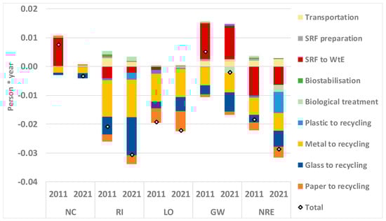 Data indicate that the evolution of MSW management in Procida was very positive. All the contributions to impact assessment in 2021 were negative, i.e., they positively affected the environment. The potential impact of GW improved by 140%, moving from 0.005 to −0.002 person*year, mainly due to the alternative management option adopted for the separately collected organic fraction and to the increased quantity of materials sent to recycling. The implementation of anaerobic digestion in place of a composting process led to better performances due to the impacts avoided resulting from obtained energy recovery. The increased amounts of glass, metals, plastics, and paper sent to recycling imply greater benefits related to the avoided production of virgin materials. The increased amount of glass sent to recycling (from 45 kg to 95 kg for FU) was the main difference between the two scenarios, resulting in an improvement for GW. On the other hand, the direct impacts of plastics recycling were higher than the avoided impacts. This is explained by the increased necessity of thermal treatment for the residues coming from the sorting stages, which amounted to about 50% of the separately collected plastics (as shown in ANNEX C) and were largely composed of plastic waste not suitable for mechanical recycling. On the other hand, the higher quantity of plastics sent to recycling (from 18 kg to 36 kg for FU), together with the implementation of anaerobic digestion of the MSW organic fraction, improved the NRE potential by 56%, due to the avoided consumption of fossil resources. The higher amount of paper sent to recycling (from 75 kg to 104 kg for FU) was the main contributor to improvement of the LO category (of about 16%) due to the avoided production of virgin paper. Categories connected to human health were also remarkably enhanced. RI improved by 47%, from −0.021 to −0.031 person*year, again with a primary contribution of recycling chains. NC improved by 143%, from +0.008 to −0.003 person*year, due to the alternative management option for bottom ashes (recovery of inert and metals instead of landfill disposal). Transportation had a limited effect on the GW, NRE and RI categories, even though it showed improved performances for 2021 related to the adoption of a more modern vehicle fleet (use of Euro 6 trucks instead of Euro 3 trucks).