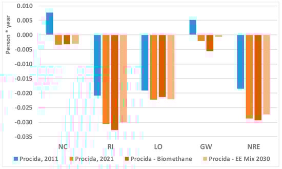 Again, with reference to Procida 2021, the scenario “Procida—EE Mix 2030” showed a worsening for the same categories, with values of up to 68% for GW. This is explained by the higher share of renewable energy sources, which have limited greenhouse emissions and lead to lower avoided impacts for AD and WtE plants. These results make the role of biomethane production from biowaste still more crucial. The scenario represents an efficient way to reduce fossil and non-renewable sources in the future when the energy mix will mainly comprise renewable sources.