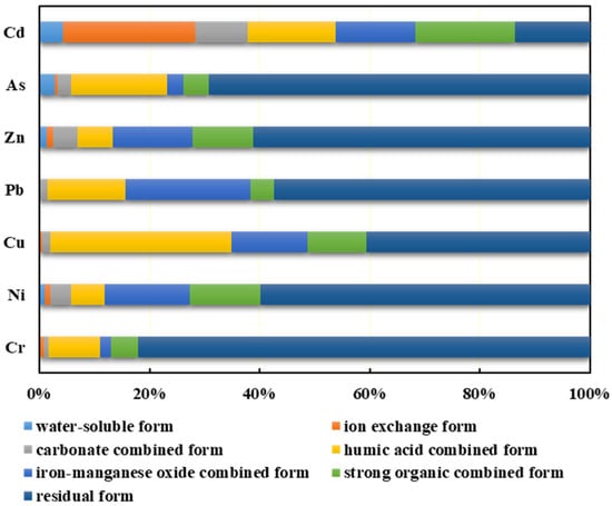 The speciation characteristics of heavy metal in the soil around the mining area are presented in Table 4 and Figure 2. Cr is mainly in residual form, with an average content of 58.67 mg/kg, accounting for 82.04% of the 7 forms, followed by humic acid combined form of 9.52%. Arsenic is mainly in residual form, with an average content of 172.02 mg/kg, accounting for 69.15% of the 7 forms. Ni, Pb, and Zn are mainly in residual form, accounting for 59.85%, 57.34%, and 61.11%, respectively, followed by iron–manganese oxide combined form, of which Pb accounts for the highest proportion, reaching 22.86%. Some studies show that Pb in air dust is mainly in iron–manganese oxide form [32]. Cu is mainly in residue form and humic acid combined form, followed by iron–manganese oxide combined form and strong organic combined form. Cd is mainly in ion exchange form, with an average content of 26.72 mg/kg, accounting for 24.12%, and the proportions of other forms are in the following order: strong organic combined form > humic acid combined form > iron–manganese oxide combined form > residual form > carbonate combined form > water-soluble form.