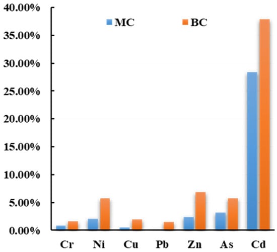 Among the seven forms of heavy metals, the water-soluble form and the ion exchange form are the most easily exchanged by other ions, and easy to be directly used by plants [28]. They have a strong migration ability and are sensitive to environmental changes. These two forms are usually used to calculate the mobility of heavy metals and are important indicators for evaluating soil heavy metal pollution. The carbonate-combined form can be extracted by mild acid, which is easily absorbed and utilized by organisms. Therefore, the bioavailability of heavy metals in soil is calculated by the sum of the water-soluble form, the ion exchange form, and the carbonate combined form [7]. The MC and BC are calculated as follows: