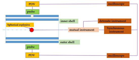 By opening a small through-hole of ϕ 3 mm in the outer steel cylinder in the direction of the explosion center, a PDV probe can be set to measure the deformation of the inner steel cylinder through the hole, while another PDV probe is set to measure the deformation of the outer steel cylinder. The experimental device for measuring the deformation of the double-layer steel shells by the PDV system is shown in Figure 4.