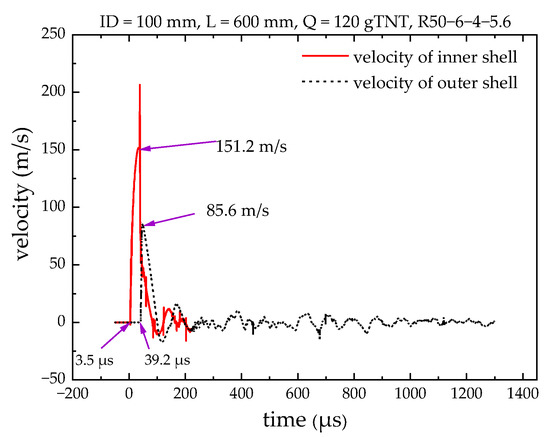The relationship between the time and the deformation of the double-layer steel cylindrical shells under a 120 gTNT explosion was obtained by PDV measurement, and the velocity curves of the inner and outer cylinders are shown in Figure 5. It can be found that the maximum velocity of the inner cylinder is 151.2 m/s. After the collision of the inner and outer cylinders, some part of the outer wall of the inner cylinder was embedded into the ϕ 3 mm through-hole of the outer cylinder, causing an instant increase in inner cylinder velocity, which led to a peak in the curve. After the collision, the velocity of the inner cylinder decreased while the velocity of the outer cylinder increased to the maximum value of 85.6 m/s. It can be seen that it takes 35.7 μs for the outer wall of the inner shell from the start of deformation to contact the inner wall of the outer shell. The gap between the inner shell and outer shell is 4 mm, and the average velocity of the radial movement of inner shell before the impact of the outer shell was calculated to be about 112 m/s.