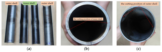 Photographs of double-layer steel cylinders after cutting. (a) Double-layer shells after cutting. (b) Inner shell after cutting. (c) Outer shell after cutting.