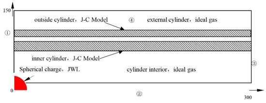 A numerical simulation of the deformation process of double-layer steel shells through the LS-DYNA program was conducted to show the deformation of the inner shell and outer shell changing with time under an internal explosion [29]. As is shown in Figure 10, a two-dimensional axisymmetric model is used: ① and ② are symmetry boundaries, and ③ and ④ are outflow boundaries. The air filled inside the inner shell and between the double-layer shells is set as an ideal gas. An Euler grid is used for the explosion and air while a Lagrange grid is used for steel shells, and the flow-solid coupling algorithm is defined between the two types of grids, which can transfer the interaction.