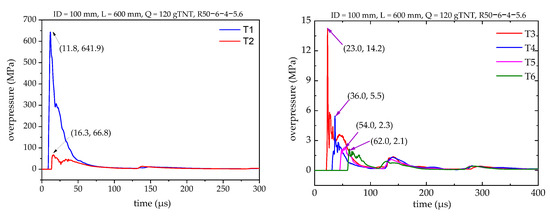 The pressure data observation points are set at 50 mm intervals along the inner steel cylinder, and the observation points numbers are from T1 to T6, as shown in Figure 11. Figure 12 shows the extracted overpressure time curve of each observation point; the maximum overpressure is 641.9 MPa at 11.8 μs.