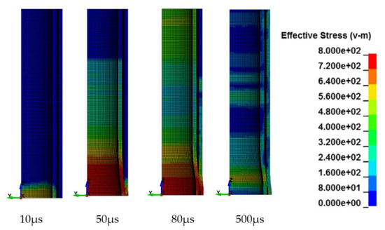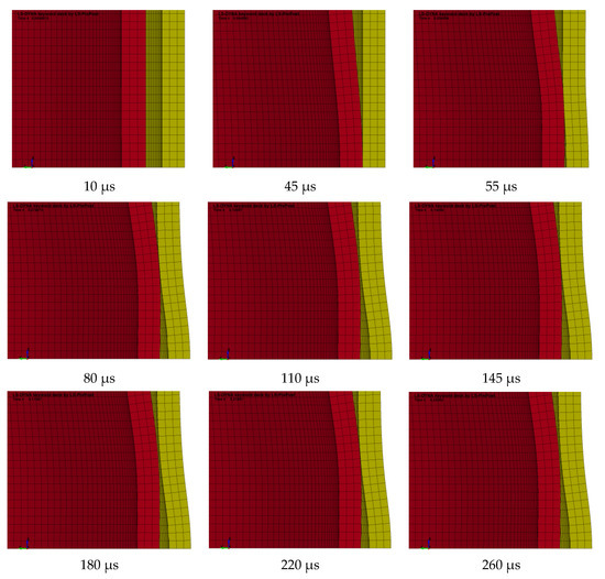 In the numerical simulation of the No. 2 experiment, when the shock wave acts on the inner steel shell, the inner shell deforms along the circumferential direction, and then, the inner shell collides with the outer steel shell, as is shown in Figure 13.