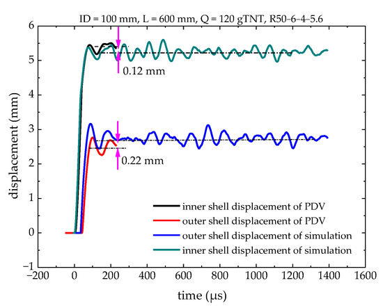 The radial displacement curves of the double-layer steel cylinders given by numerical simulation and PDV measurements are shown in Figure 16, which are basically matched. The maximum displacement of the inner cylinder given by simulation is 5.29 mm, while that measured by PDV is 5.41 mm, with an error of 2.2%. The maximum displacement of the outer cylinder given by the simulation is 2.67 mm, while that measured by PDV is 2.45 mm, with an error of 8.2%. It can be concluded that the results shown by the numerical simulation and PDV measurement are coincidental.