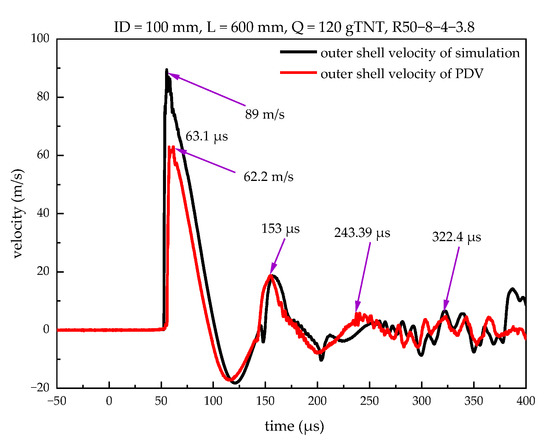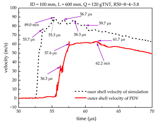 The radial velocity curves of the double-layer steel cylinders given by numerical simulation and PDV measurement are shown in Figure 15, which are basically matched. The maximum velocity of the inner cylinder given by the simulation is 150.8 m/s, while the velocity measured by PDV is 151.2 m/s, with an error of 0.2%. The maximum velocity of the outer cylinder given by the simulation is 121.1 m/s, while the velocity measured by PDV is 85.6 m/s, with an error of 41.5%. The larger error is caused by the vibration of the PDV measuring devices during the explosion.