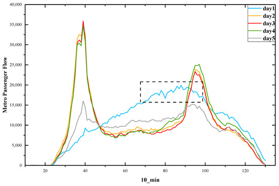 As can be seen in Figure 1, the pattern of flow volume on 1 January (the blue curve in the figure) was significantly different from that on other weekdays and weekends. This is due to the fact that peak traffic did not occur at the usual morning and evening peak traffic period and is lower than normal peak traffic. Considering the negative impact of the holiday season on projections of passenger traffic, we used only 24 days of travel data from 2 to 25 January in this paper. All data were normalized to the range (0, 1) with min–max scalers.