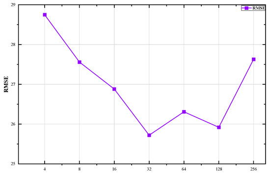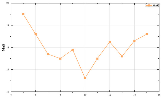 All figures were generated and executed on a desktop computer with an AMD Ryzen 7–5800H with Radeon Graphics, and an NVIDIA GeForce RTX 3070. The model presented in this paper was deployed and experimented with on Google Colaboratory using Pytorch version 1.12.0. We use two layers of GCN layer in the multi-graph convolution module, the number of heads in the temporal self-attention module was set to 3, the number of heads in the spatial self-attention module was set to 2, and we set the kernel size in the temporal convolution module to 3. Dropout = 0.2 was set up in both the multi-graph convolution module and the spatial–temporal self-attention module. In addition, the historical time step was set to [5,15], and the batch-size was set (4, 8, 16, 32, 64, 128, 256) in this experiment; the testing results are shown in Figure 4 and Figure 5. Notably, during the training phase, the model was trained with 200 iterations and an early stop was set as 40 to preserve the optimal model, with a learning rate of 1 × 10−3. MAE was used as a loss function for the training process, and the optimizer used Adam optimization. We divided the Hangzhou datasets according to the rules of 70% training, 10% validation, and 20% testing. The result evaluation was conducted after the predicted results were rescaled to their original scale range.