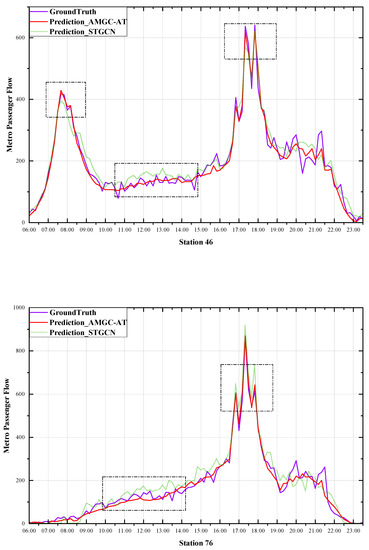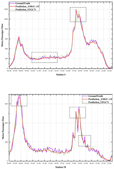 Figure 8 shows that the AMGC-AT model and the STGCN model presented in this paper can accurately predict the flow of passengers on different routes, functions, and geographical locations. It should be noted that our model is most accurate at both peak and sub-peak times, and neither model can fit the fluctuations well at flat peak times, which we believe is related to the min–max normalization method causing the model to lose some sensitivity to numerical fluctuations at lower traffic volumes. However, the AMGC-AT model predictions were not significantly different from the actual values. We conclude that the prediction results demonstrate that our proposed model is reasonable and robust. This model will guide subway operators in making reasonable peak-period travel schedules and assist travelers in planning their trips.