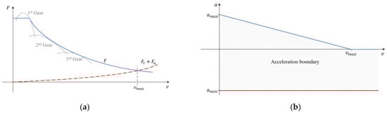 Constraints of longitudinal force and acceleration: (a) the constraint of longitudinal force varies with the transmission gear ratio; (b) the simplified acceleration constraint for the vehicle model.