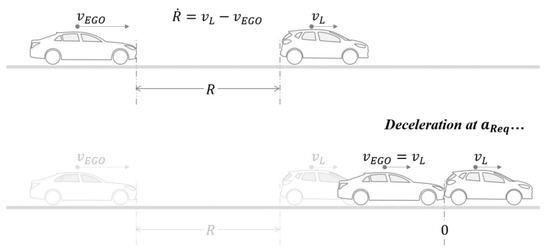 Next, we analyzed the sailing and braking start times of human drivers. In Figure 5, shown in the previous section, human drivers generally coast down before stopping, which is related to the timing of pressing the brake pedal. In other words, typical human drivers have a similar driving pattern, which sequences as acceleration, sailing, and braking. Such driving can be viewed as one of the driving characteristics derived from human drivers. To analyze the driving characteristics at the beginning of the time of braking, the required deceleration for braking is calculated and analyzed from data. The required deceleration means the deceleration required for a complete stop when the relative distance is and the relative speed is . Figure 6 and Equation (10) express the required deceleration calculation.